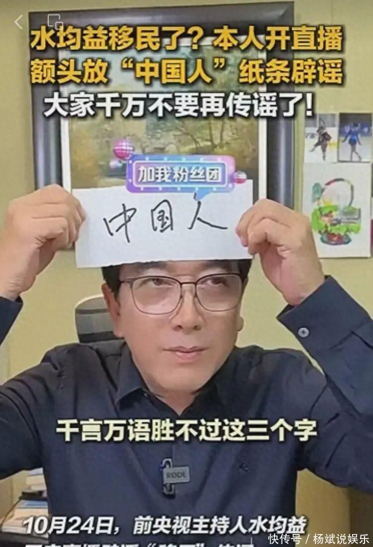 这画面,荒诞得像段子。10 月 24 号晚上,62 岁的前央视名嘴水均益坐在镜头前,额头上端端正正贴着张写有 “中国人” 的纸条,语气里满是无奈。这场直播刚播了十分钟,# 水均益 额头贴纸条辟谣 #就冲上了热搜,底下几万条评论吵得不可开交,有人心疼老主播被逼到这份上,也有人翻出各种细节继续追问,看得人心里五味杂陈。要是熟悉水均益的人都知道,这位曾在《焦点访谈》里怼过跨国企业、在《高端访问》里专访过五十多个国家元首的老记者,这辈子最看重的就是 “真实” 二字。可谁能想到,退休多年的他,如今却要靠这种近乎 “自证” 的方式,来回应满天飞的移民谣言。这事儿得从大半年前说起。今年 6 月初,网上突然冒出来 “水均益举家移民海外” 的说法,有人说他早就拿到了外国绿卡,还晒出了所谓的 “定居照”—— 后来才发现是几年前他去加拿大探望留学的女儿时拍的。当时水均益没太当回事,6 月 10 号只是在微博发了张全家回国的照片,配了句 “月是故乡明。回家!”,顺手晒出了自己的中国护照,红色封皮在阳光下特别显眼。本以为这就能堵住悠悠众口,没想到谣言跟长了腿似的,没过一个月又冒了出来。这次传得更邪乎,说他连北京的房子都卖了,老家兰州的亲戚也搬去国外了。